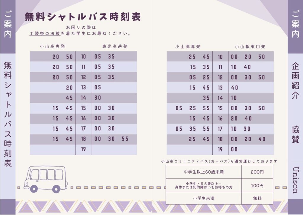 ▽小山駅⇔小山高専 と 東光高岳駐車場⇔小山高専 の無料シャトルバスの時刻表