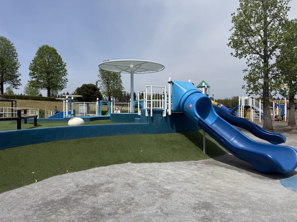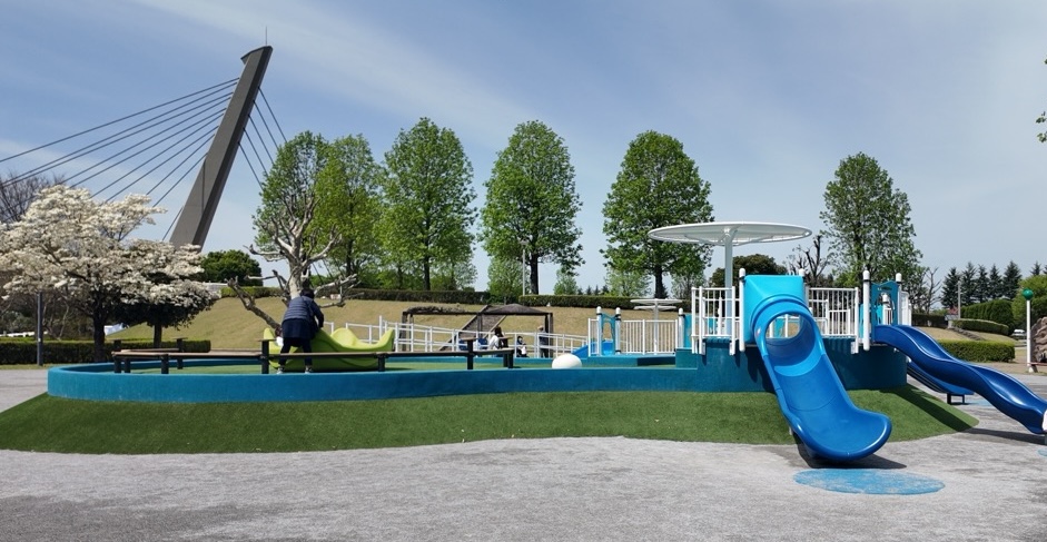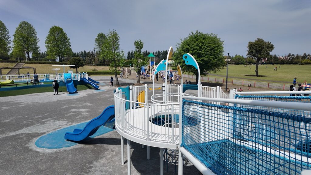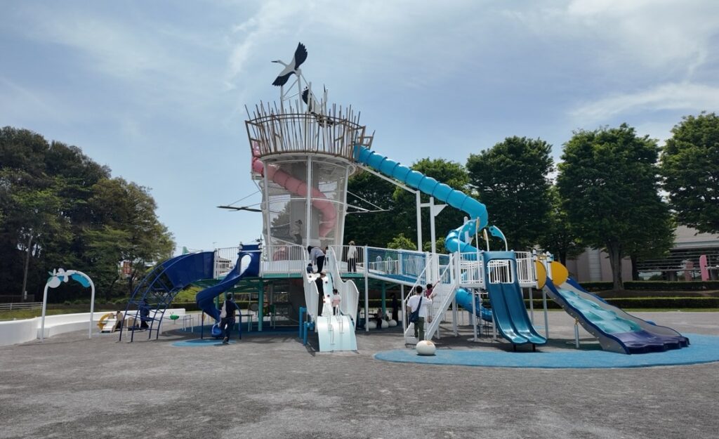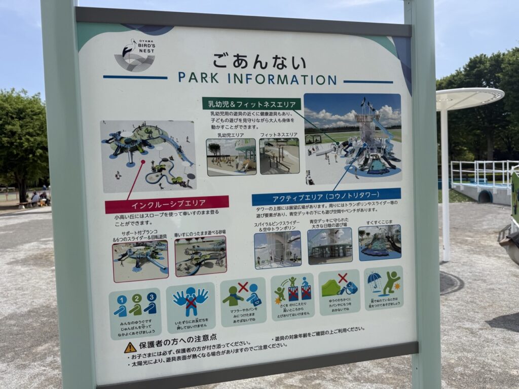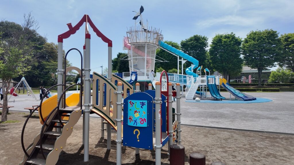 遊具は、コウノトリタワーのアクティブエリア、乳幼児&フィットネスエリア、インクルーシブエリアに分かれていて、乳幼児の小さな子どもから楽しめる公園です。