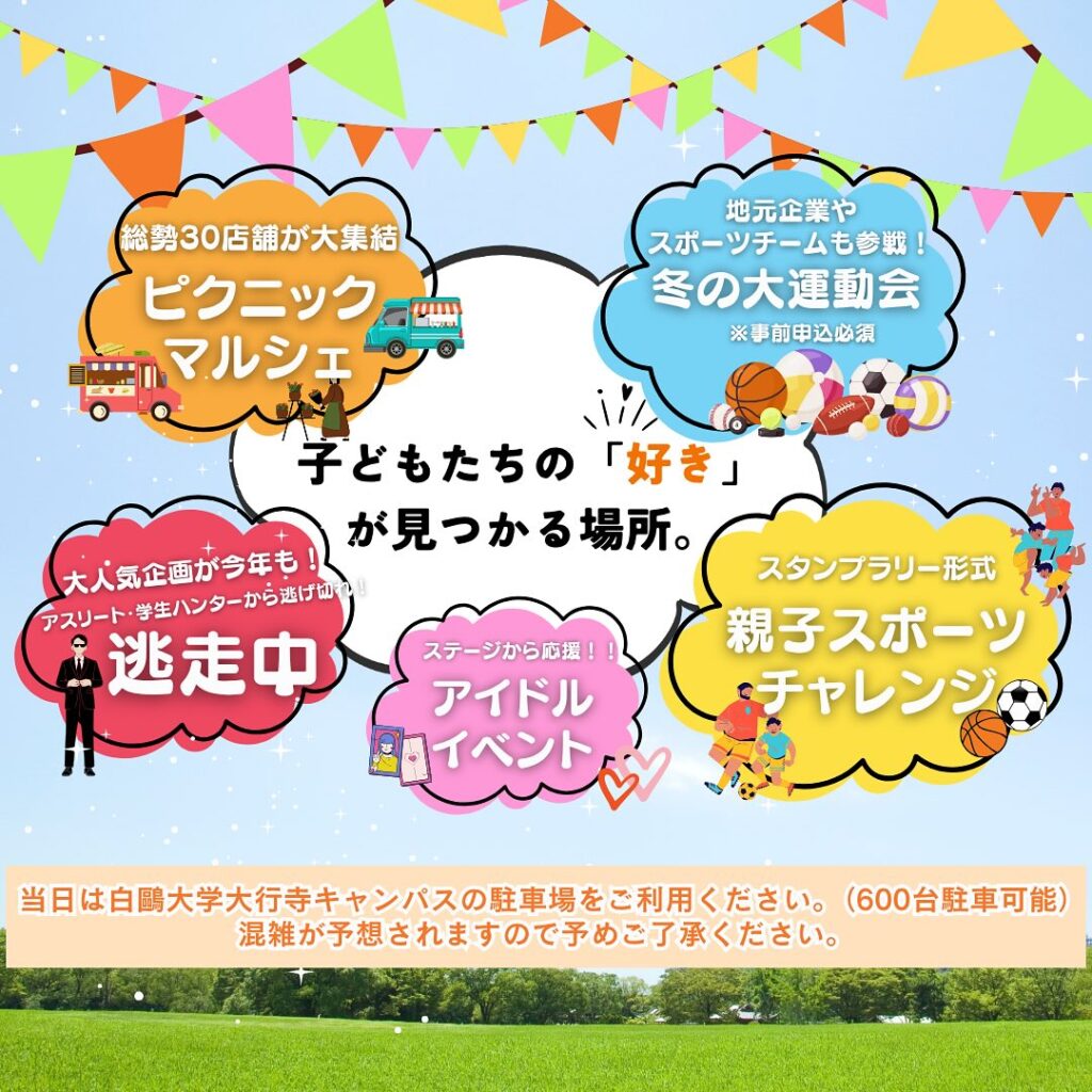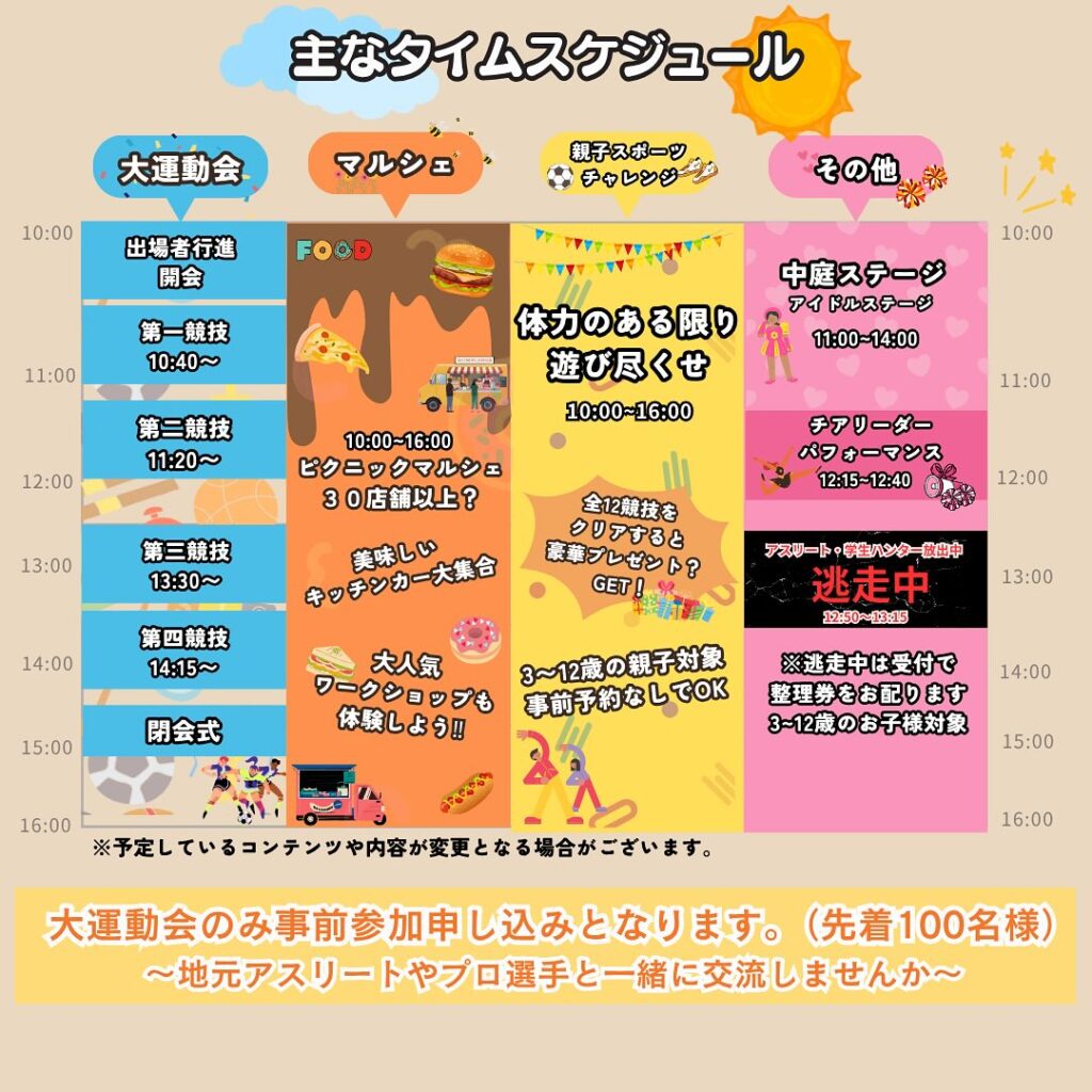 - 内容:大運動会や親子スポーツチャレンジ、ピクニックマルシェ(30店舗)、逃走中、アイドルステージなど