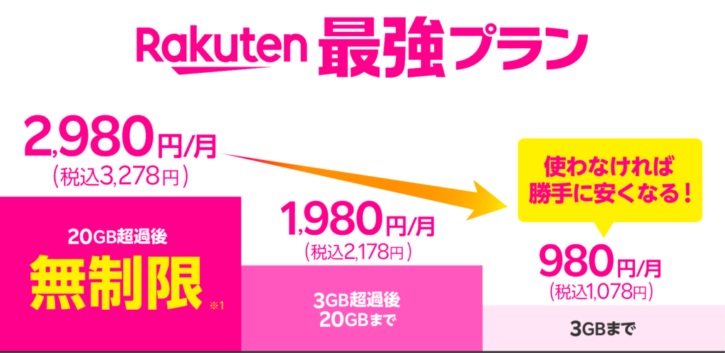 人気の1つは、料金形態の「Rakuten最強プラン」。毎月のデータ利用量で支払い金額が決まる圧倒的な低価格プラン「Rakuten最強プラン」は、データを使わなければ勝手に安くなる料金プラン。プランを選んだり変更したりする煩わしさないのも魅力の1つ。