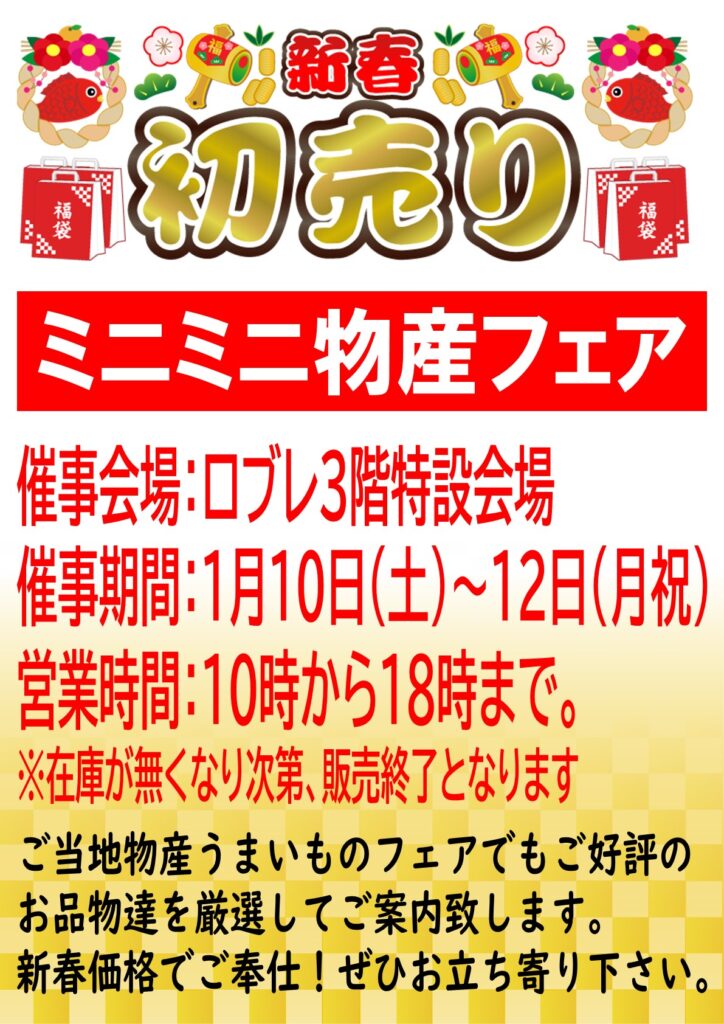 小山市にあるロブレで「ミニミニ物産フェア」が3連休(2026年1月10日〜12日)の3日間限定で開催。ご当地物産うまいものフェアで好評の商品が、新春価格で並びます。