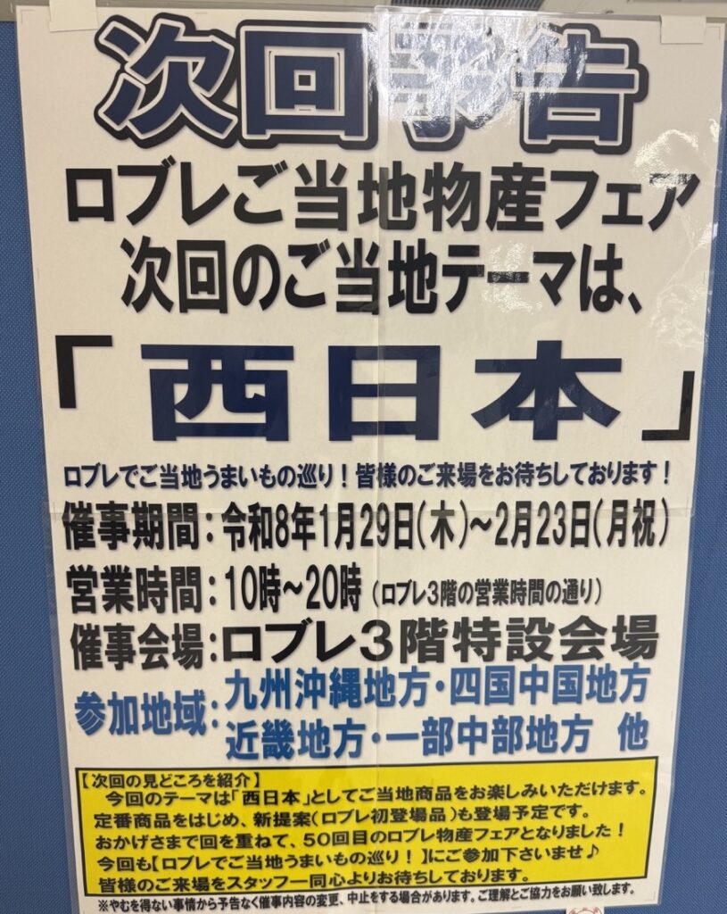 ロブレで毎回好評の ご当地物産フェア次回のテーマは「西日本」。1月29日から開催されます。ちょっとした旅気分や懐かしい味に出会えるので毎回足を運んでいる御当地フェア。こちらも楽しみです!