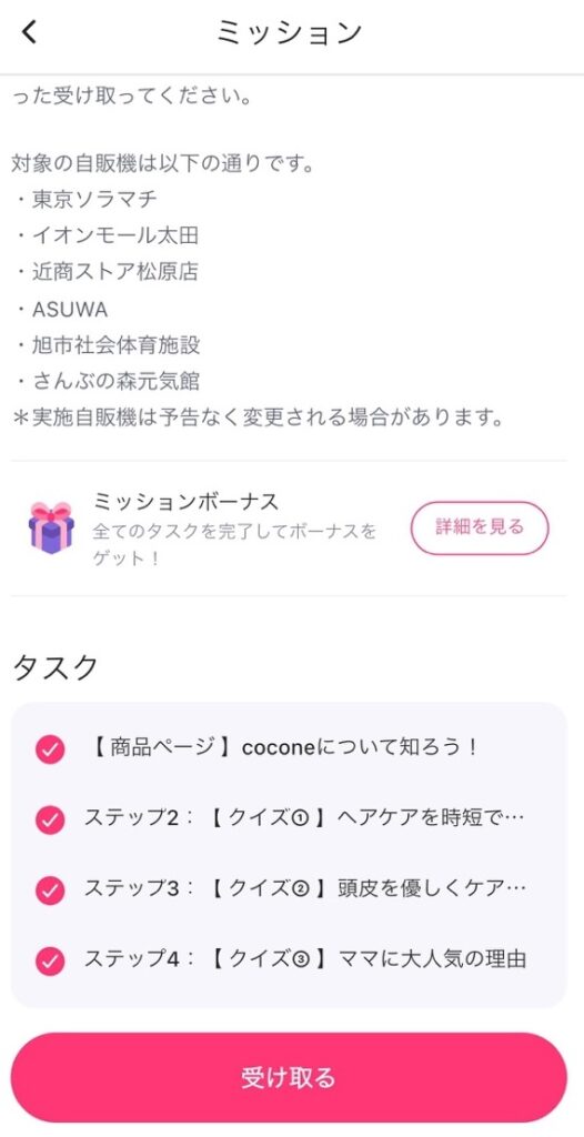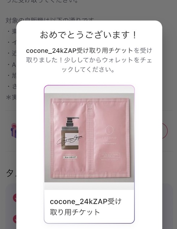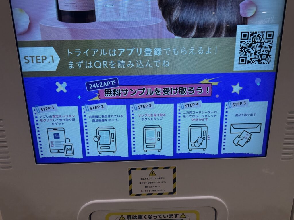 表示されたQRコードを自販機に読み込ませるとサンプルがもらえました。