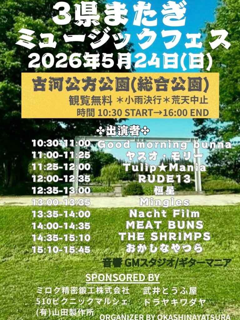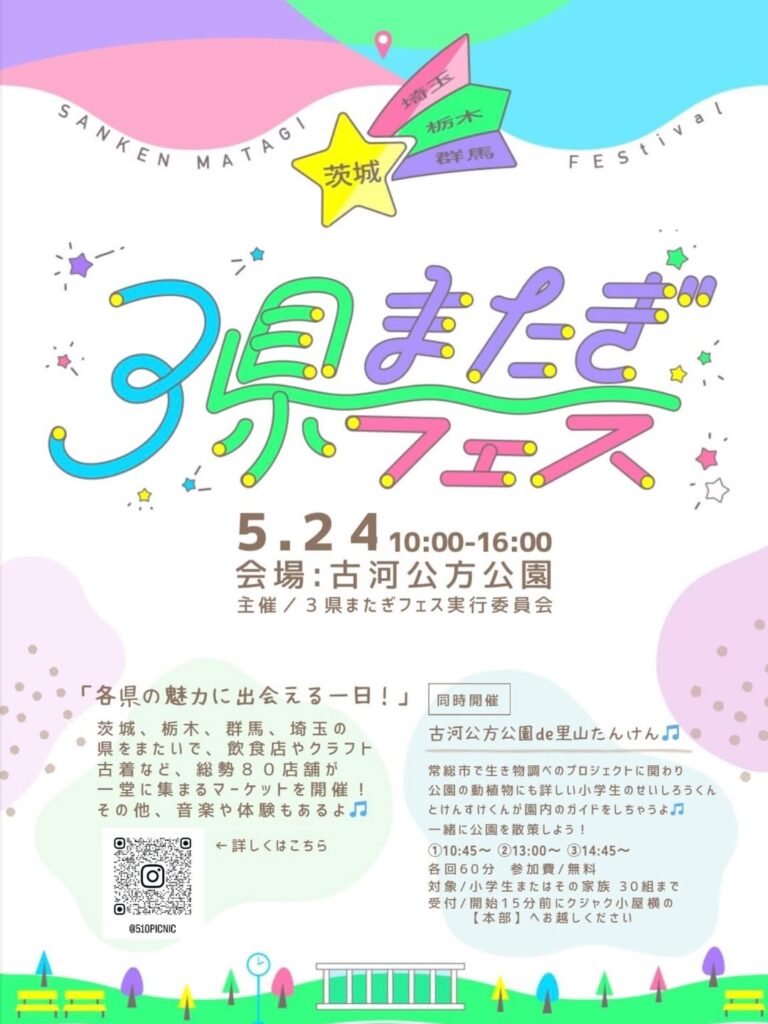 古河市の古河公方公園で「3県またぎフェス」が5月24日(日)に開催されます。