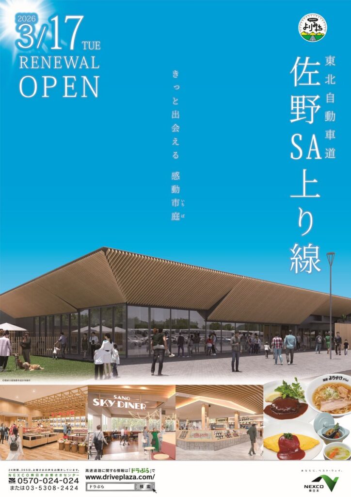 東北道上り線の佐野SAは、地域性充実の地域性充実の「ドラマチックエリア佐野(上り線)」として2026年3月17日10時にリニューアルオープンします。