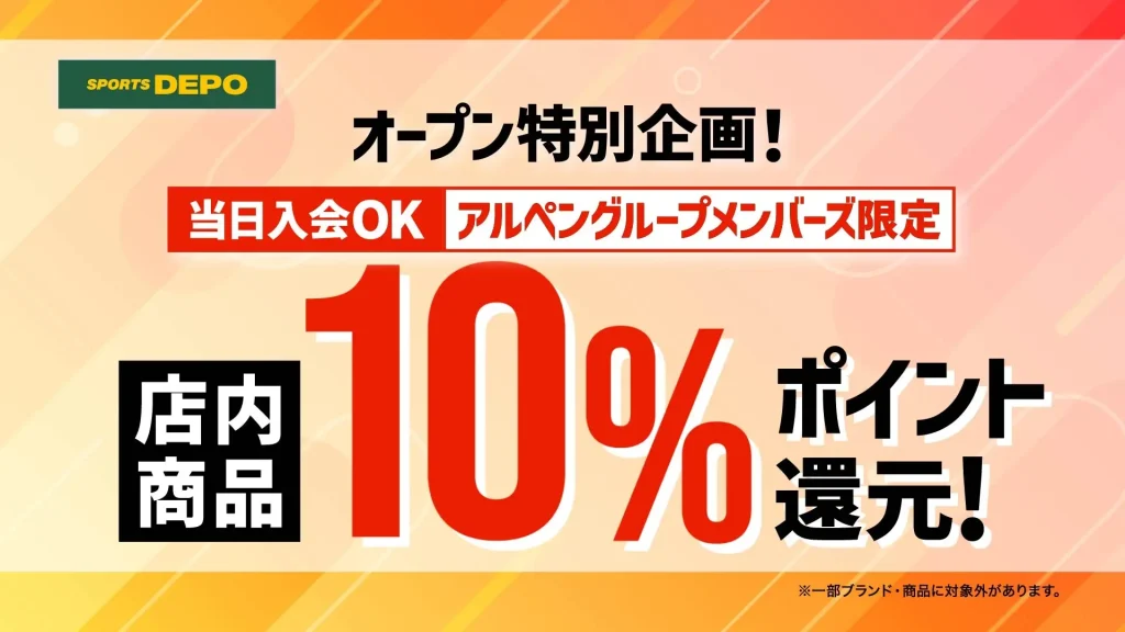 期間中、店内商品をお買い上げで「アルペンポイント10%還元」を実施。※当日入会(年会費無料)の方も対象。※一部対象外商品もあり