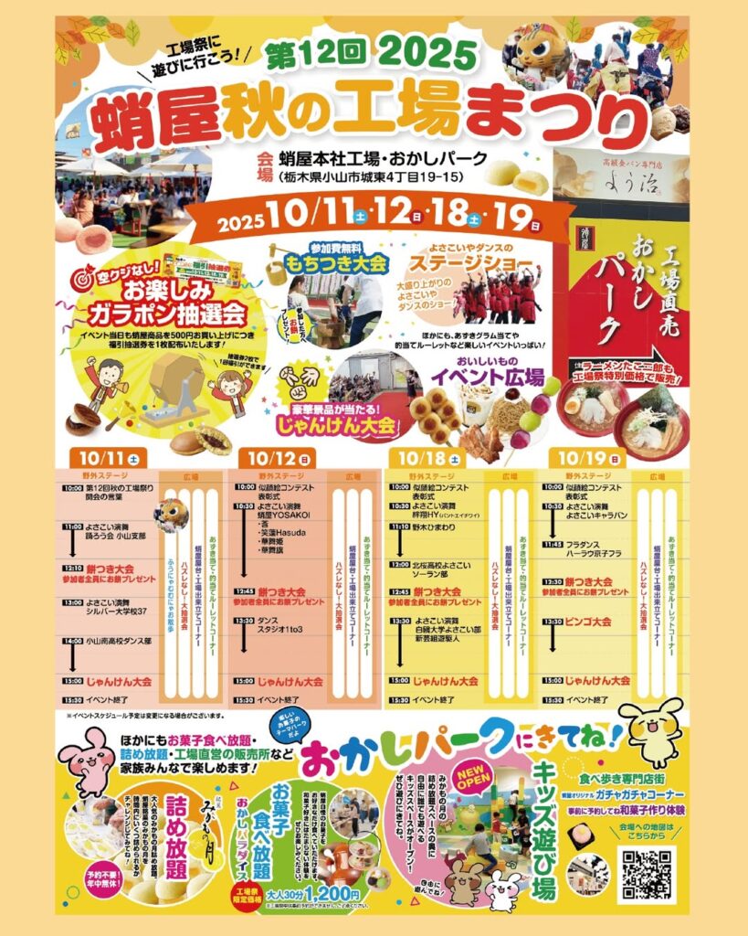 栃木県小山市にある和菓子店の蛸屋の本社工場で、「蛸屋 秋の工場まつり」が開催されます。期間は、2025年10月11日(土)・12日(日)と2025年10月18日(土)・19日(日)の4日間。