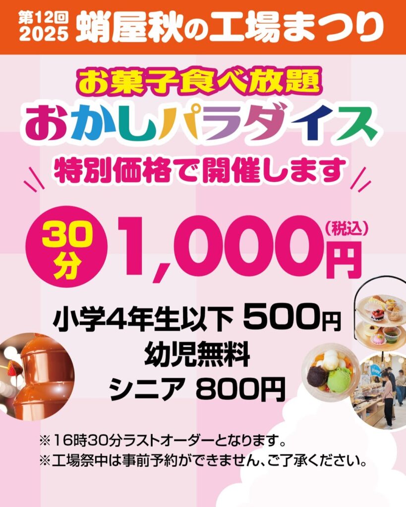 秋の工場まつりのお菓子の食べ放題は30分で大人1,000円。(小学4年生以下500円、シニア800円、幼児無料)。当日の順番待ちの予約OK。イベントは10時からですが、会場は9時にオープンするので、10時スタートの食べ放題予約は当日9時からできますよ。
