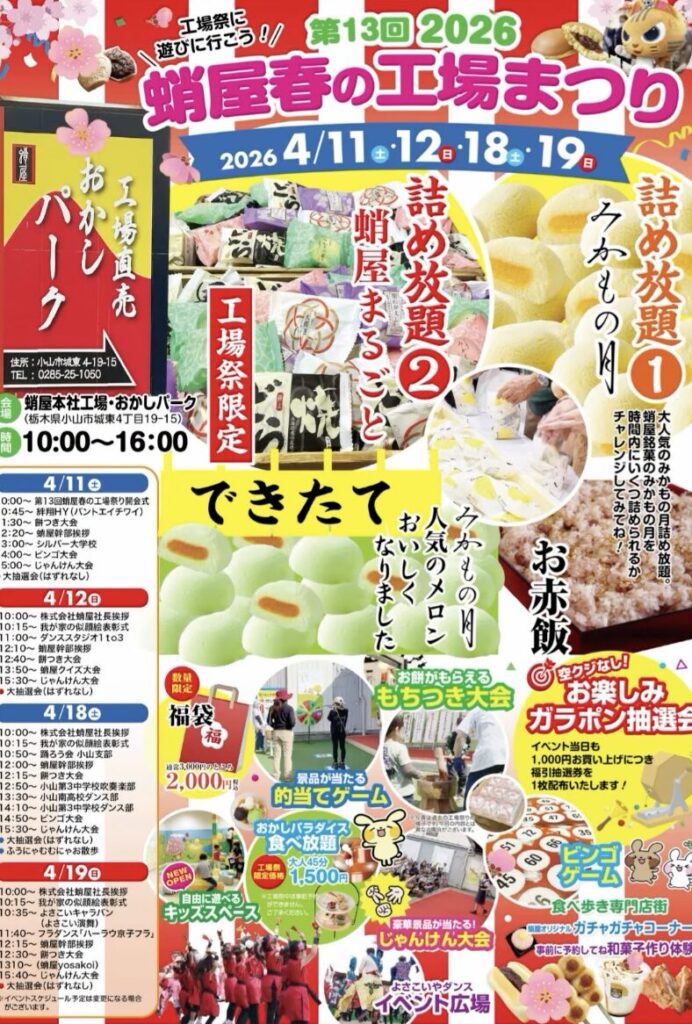小山市で毎年大人気のイベント「第13回 蛸屋 春の工場まつり」が、2026年4月11日(土)・12日(日)・18日(土)・19日(日)の4日間にわたって開催されます。会場は、蛸屋本社工場・おかしパークにて。