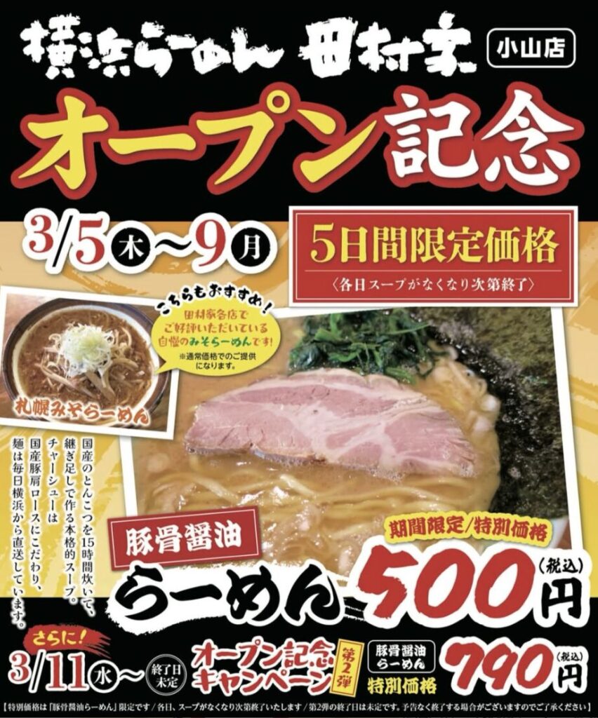 「横浜らーめん田村家小山店」では、オープニングキャンペーンを開催!リニューアルオープン記念として、3月5日(木)〜9日(月)までの5日間、家系ラーメン1杯を500円にて提供します。