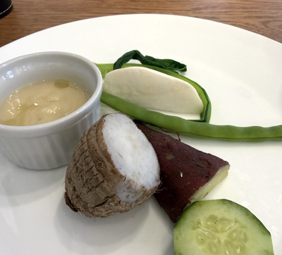 さといもやさつまいも、きゅうり、カブなどの野菜をバーニャカウダのソースに付けて食べます。バーニャカウダのソースがめちゃくちゃ美味しい!バーニャカウダの旨味と塩気のバランスがとってもよくて、野菜本来の美味しさをひきたてます。プレートを見ると素朴で地味に思えますが(失礼!)、最高に美味しい一品でした。