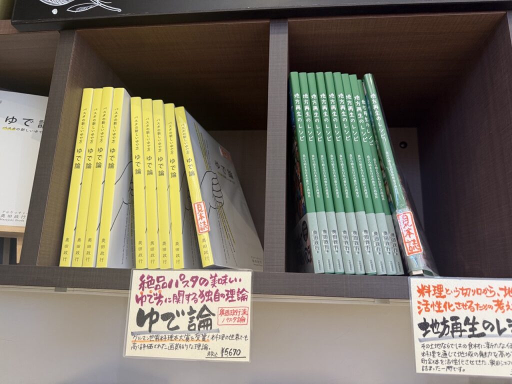 レストランを監修されている世界的シェフの奥田政行氏の書籍が入口に並んでいます。