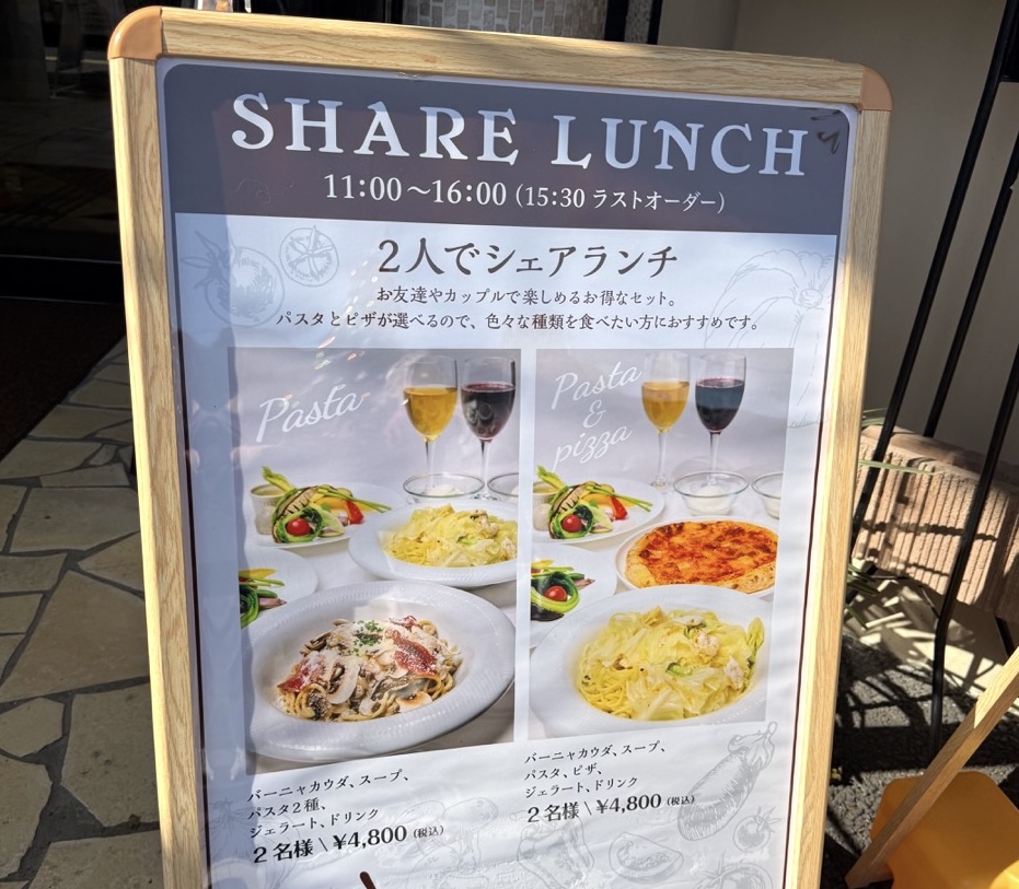 - 2人でシェアランチ…お友達やカップルで楽しめるお得なセット。パスタとピザが選べるので、いろんな種類を食べたい方におすすめ