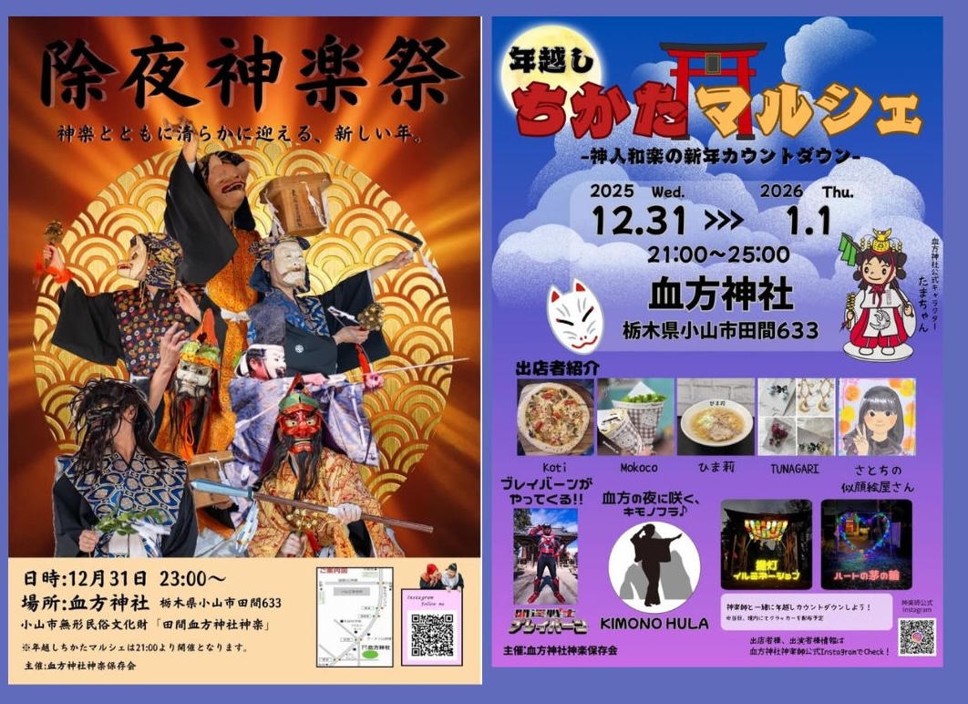 栃木県小山市にある血方神社にて大晦日に「除夜神楽祭」と「年越しちかたマルシェ」が開催されます。年越しちかたマルシェは初開催。小山市の無形民俗文化財に指定されている神楽を鑑賞しながら、マルシェでグルメを楽しみ、年越しができます。