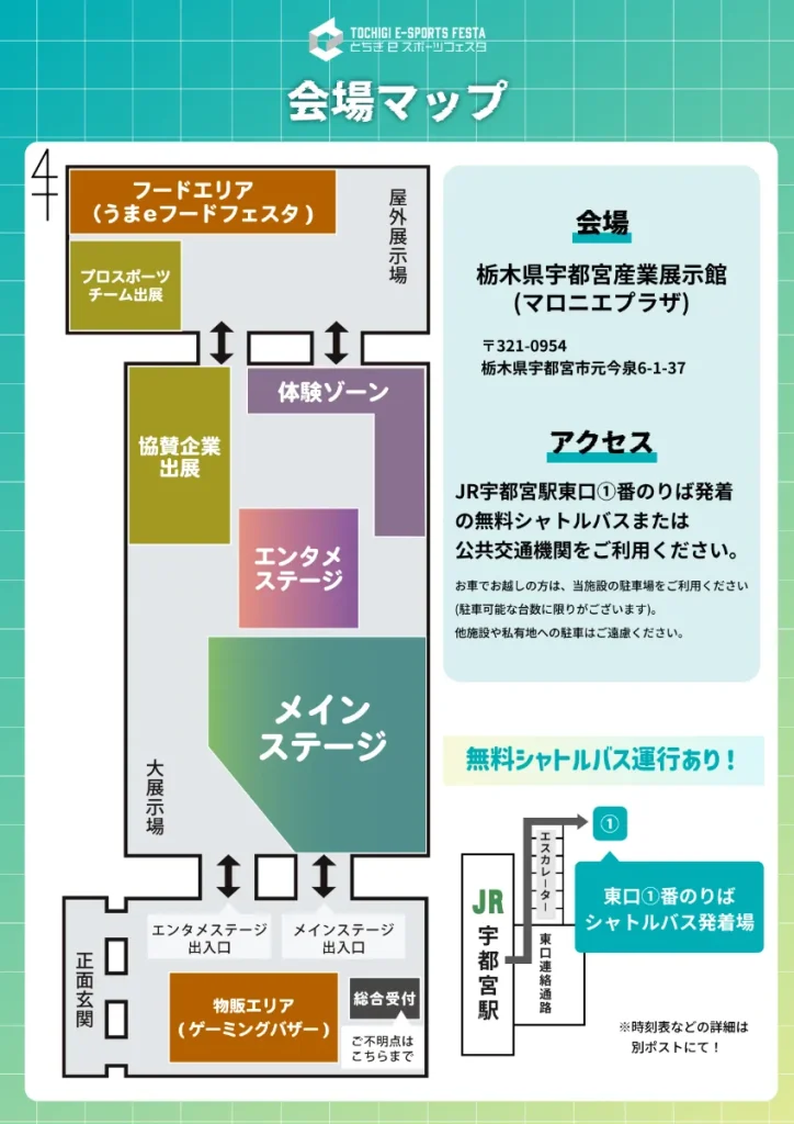 〒321-0954 栃木県宇都宮市元今泉6-1-37 - アクセス:当日は宇都宮駅東口①番のりばから無料シャトルバスが運行