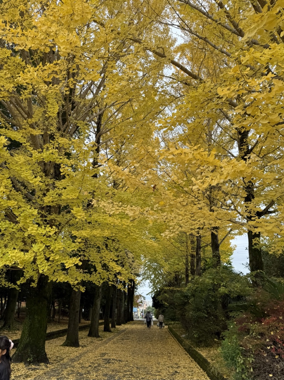 獨協医科大学の正門から続く約200mの並木道は、秋になると黄金色に染まるイチョウがまっすぐに伸び、まるで映画のワンシーンのような美しさです。一般開放されており、見頃の時期には多くの見物客が訪れます。晴れた日の青空とのコントラストも格別です。