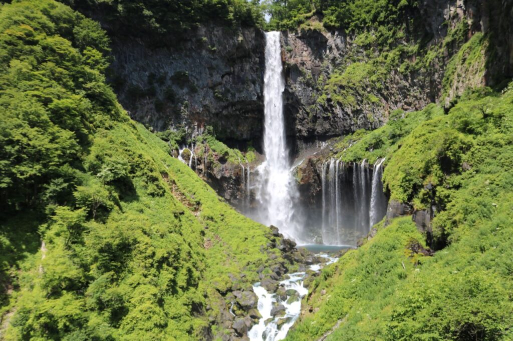 日本三名瀑のひとつの華厳の滝。落差97mの迫力ある滝と紅葉のコントラストが美しく紅葉シーズンだけでなく季節通して一年中人気のスポットです。華厳の滝のまわりにはお土産屋さんがあり、食べ歩きグルメを楽しむのもおすすめ。