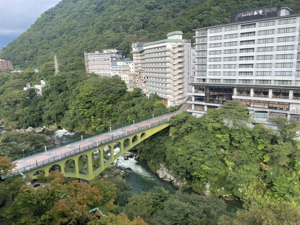 全長320m・高さ約30mの日本最大級の歩道吊橋で、塩原ダム湖の上空から紅葉の絶景を望むことができます。料金はおとな300円、小中学生200円。橋の上からは、湖面に映る紅葉や遠くの山々の色づきを一望でき、スリルと美しさを同時に味わえる人気スポットです。秋晴れの日には、空と紅葉のコントラストが特に映えます。