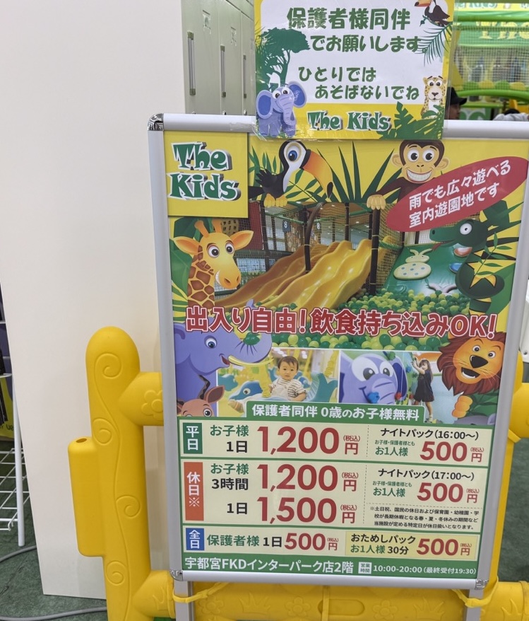 • – おあそびプラン(0~3歳+保護者2名まで):600円(延長100円/10分)