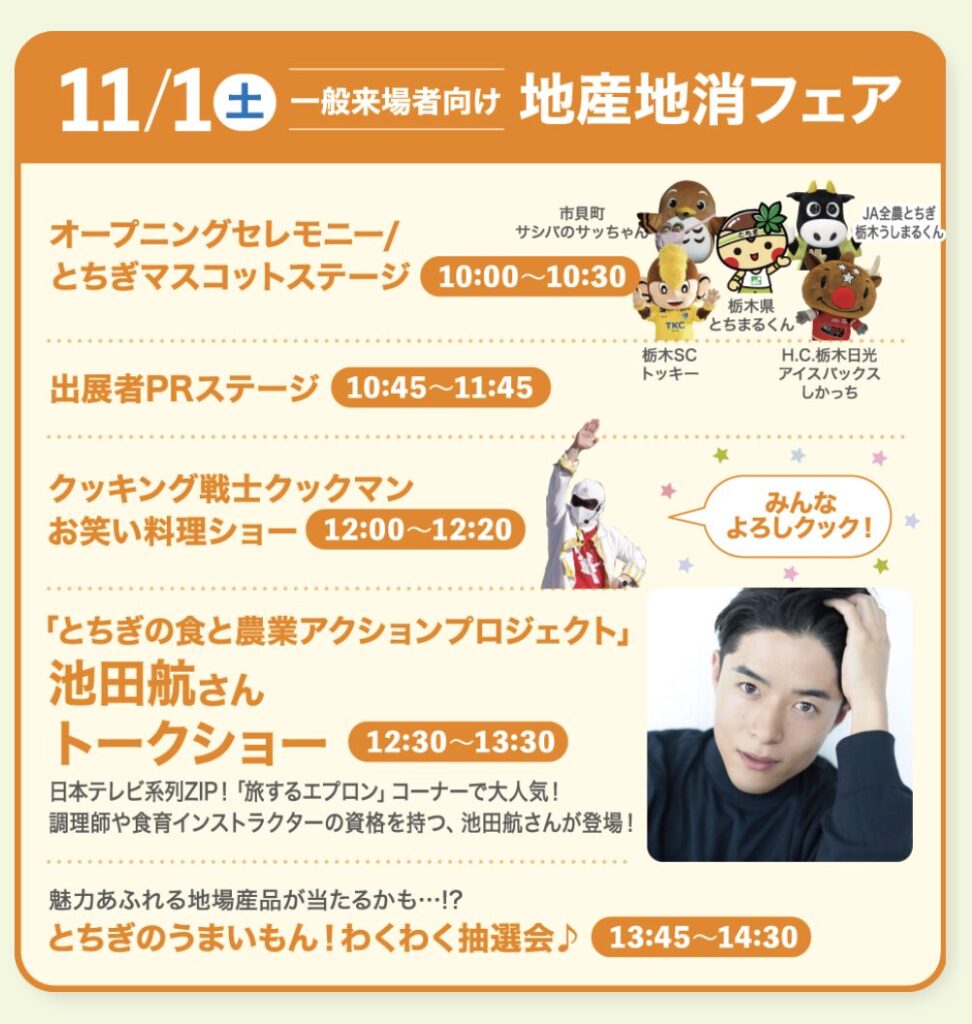 - 「とちぎの食と農業アクションプロジェクト」池田航さん トークショー:12:30~13:30日本テレビ系列ZIP!「旅するエプロン」コーナーで大人気!、調理師や食育インストラクターの資格を持つ、池田航さんが登場!