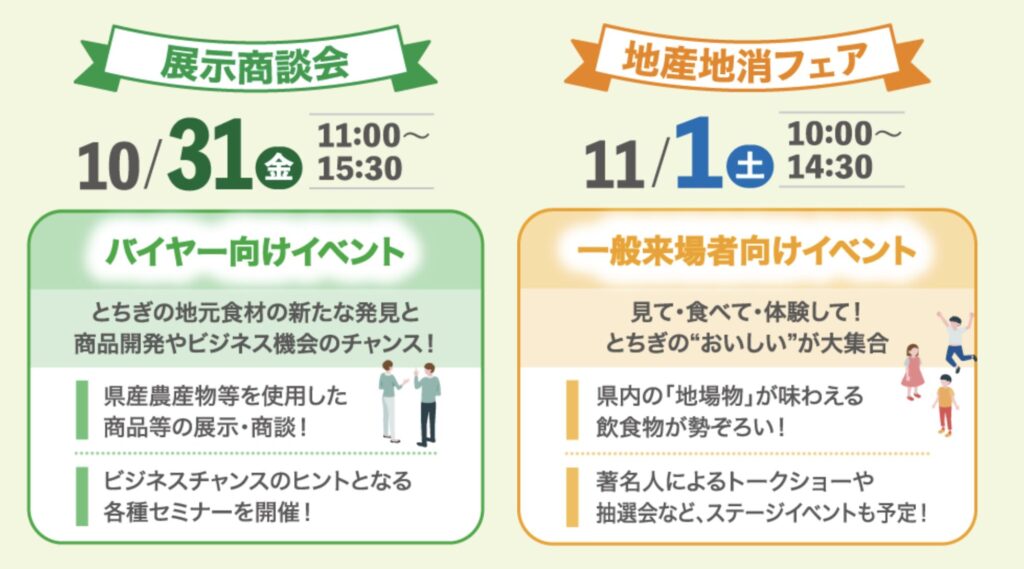 「とちぎの食と農 魅力発見フェア2025」が宇都宮市のマロニエプラザで2025年10月31日と11月1日の2日間、開催されます。10月31日は展示商談会でバイヤー向けのイベント。