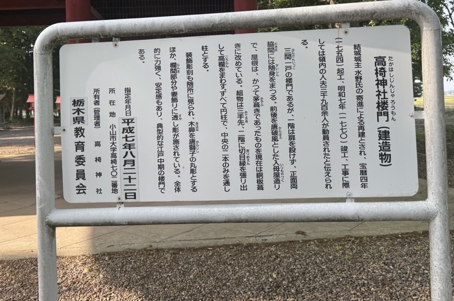 高椅神社は「結城第一のやしろ」として結城氏の歴代当主の厚い保護を受けました。またその楼門は、のち江戸時代に結城城主となった水野氏の寄進による再建(1754–70年)であることが説明に書かれています。