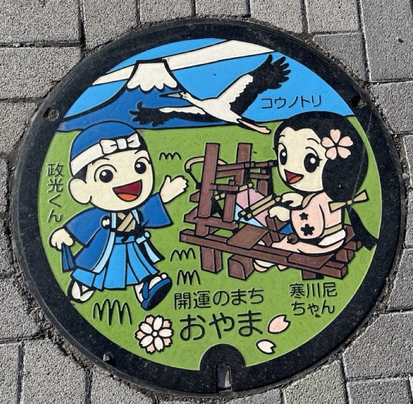 小山市役所前にあるご当地マンホール。政光くんと寒川尼ちゃん