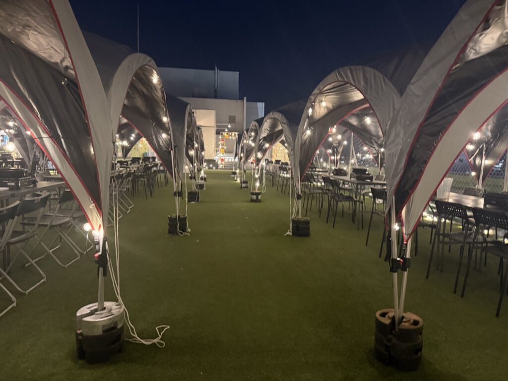都心の屋上で気軽にアウトドア体験ができ、子ども連れでも仕事帰りでも利用しやすいスポット。タープが張られているため、雨の日や日差しが強い日でも安心して楽しめる全天候型のビアガーデン&BBQです。