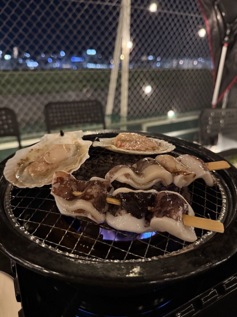 卓上のコンロで焼くだけなので、楽ちん。風が心地よくビールも美味しくて、お肉や海鮮を頬張る幸せ!