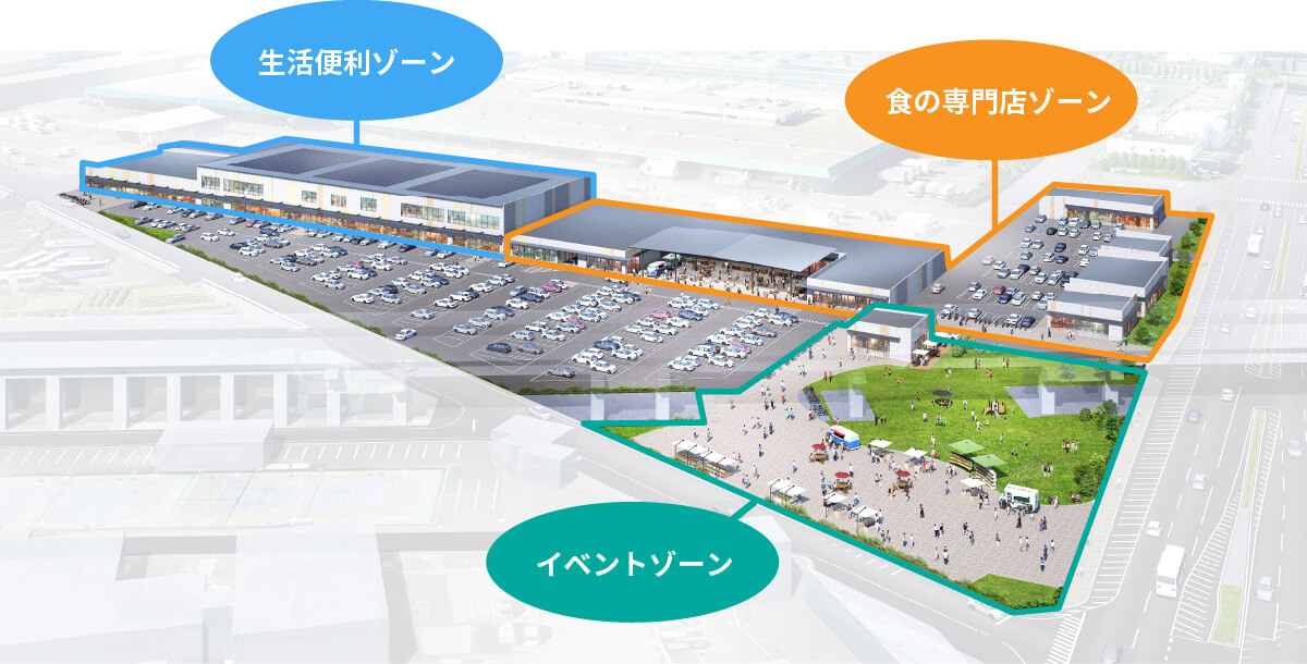 にぎわいエリアは、「生活便利ゾーン」、「食の専門店ゾーン」、「イベントゾーン」の3つに区分されそれぞれテナントが入ります。生活便利ゾーンには、ドラッグストアやスーパー、食の専門店ゾーンにはまぐろ専門店やスイーツ店、焼き肉や餃子のお店など、全部で約20店舗が入る予定。