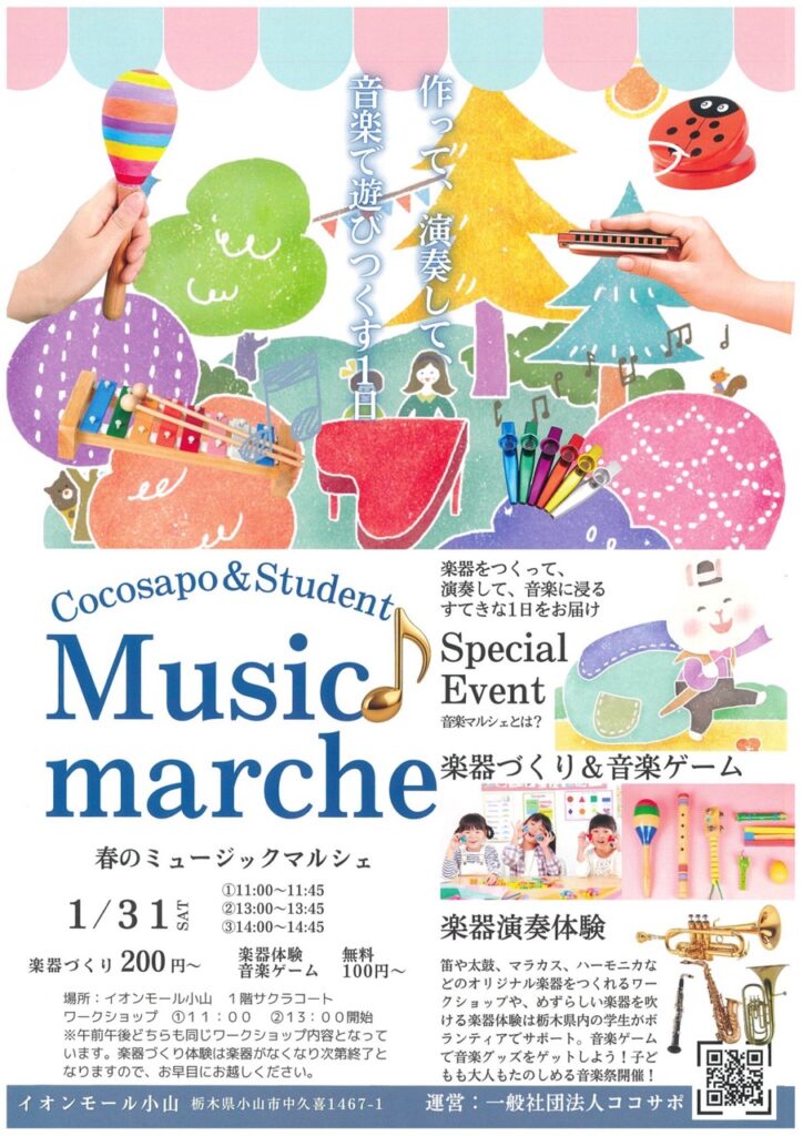 イオンモール小山で「冬のミュージックマルシェ」が2026年1月31日に開催!ワークショップは3回開催され、楽器づくり体験や音楽ゲーム、楽器演奏体験などが予定されています。子どもから大人まで楽しめる音楽祭です。