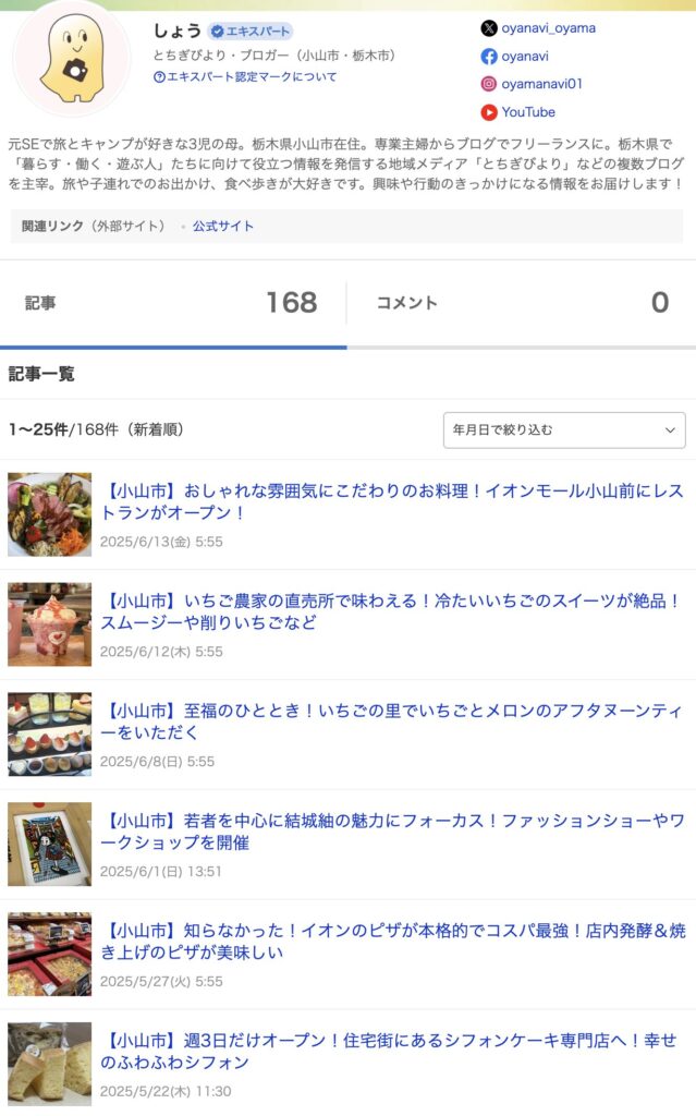 わたしは、yahoo!ニュース エキスパート 地域クリエイター(小山市・栃木市担当)として2022年6月より活動をし、168記事をYahoo!ニュースで執筆しました。