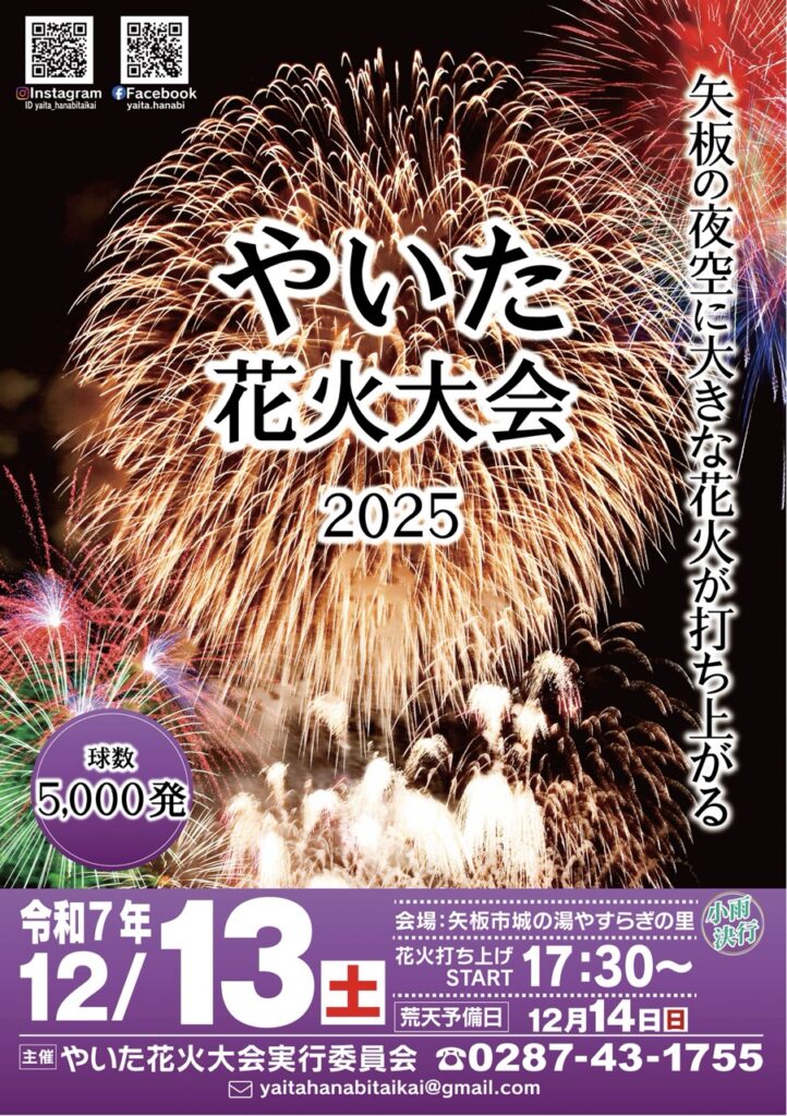 2年ぶりに「やいた花火大会2025」が12月13日(土)に開催されます。冬の夜空に打ち上がる約5000発の大輪の花火。冬の澄んだ夜空に打ち上がる花火はひときわ美しく彩ります。