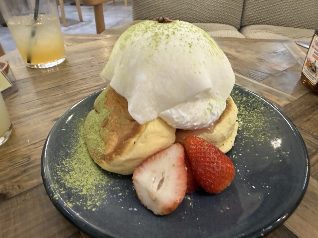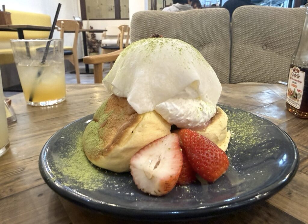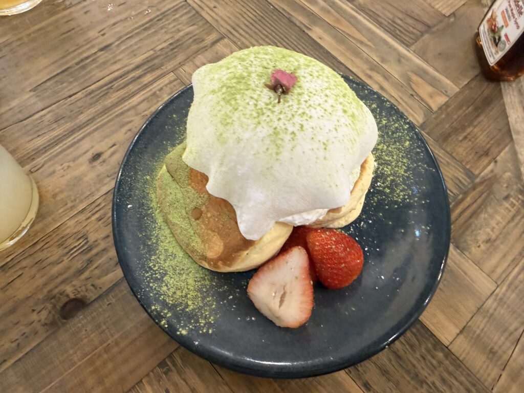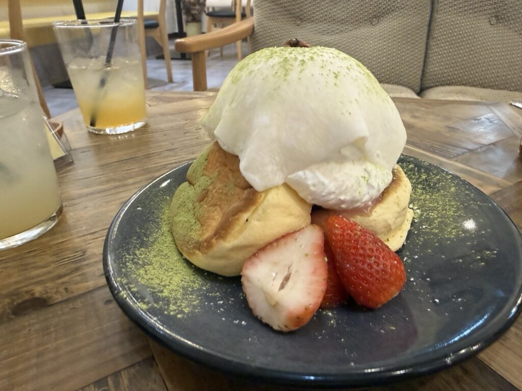 口に入れるととろけるようなふわふわのスフレパンケーキと濃厚な抹茶アイスの相性は抜群です。口溶けの良い生クリームにほのかに感じる桜餡がアクセント。