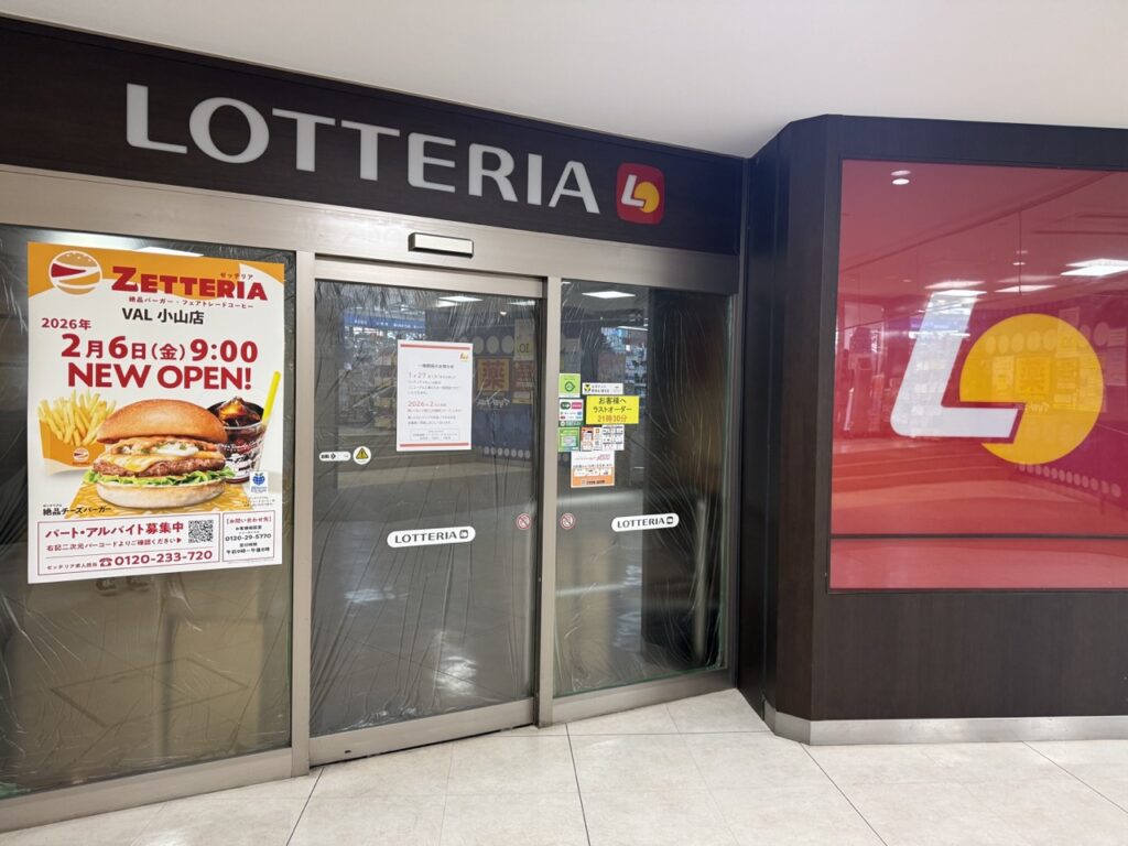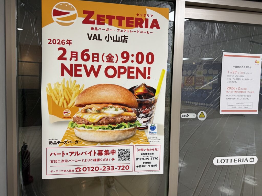 ロッテリアVAL小山店は2026年1月27日でリニューアルのため閉店2026年2月6日にゼッテリア(ZETTERIA)としてニューオープンの予定です。